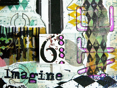 Materials used: painting board, fine sand texture paste, two clock glasses, Adirondack Alcohol Inks, Ranger Distress Inks, DecoArt Traditions acrylic paints, eyelets, wire, rubber stamping (Prima) and embossing with Ranger embossing powder "Rust", stencils (Tim Holtz and TCW), scrapbooking papers and dictionary pages, copper plates and a Sizzix metal embossing folder, Artemio letter stamps, Ranger black jet archival ink